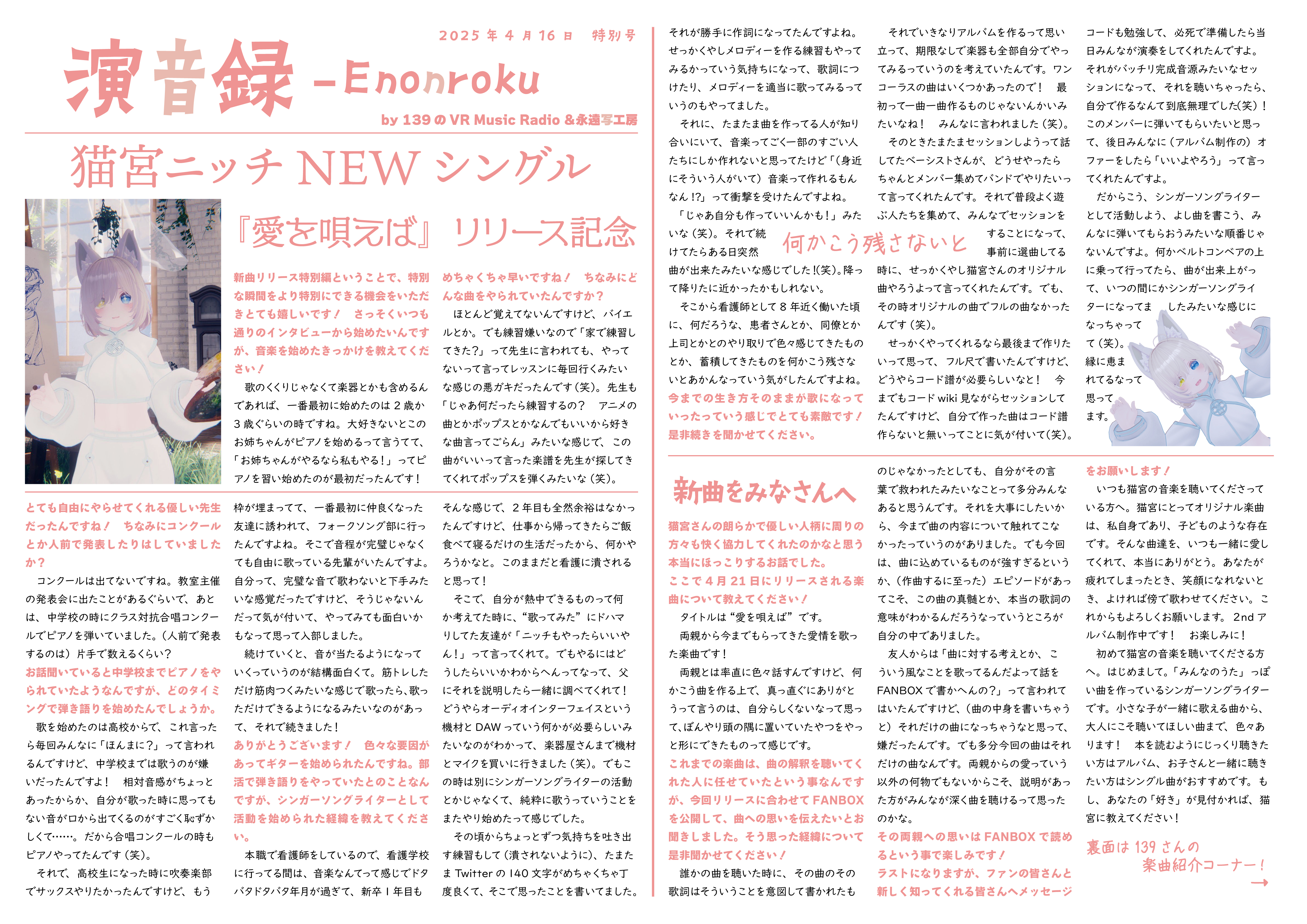 ダウンロードはこちらから→特別号 猫宮ニッチ 様(シンガーソングライター)(新曲リリース記念号)